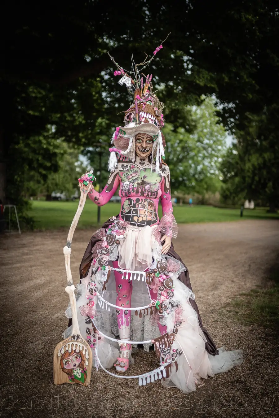 Porotou jsou v této soutěži návštěvníci akce, kteří hlasují o vítězi. A podle toho jsem své dílo taky připravovala. Velká konkurence co se malby samotné týče, především ze zahraničí, mě nutila přemýšlet nad tím trochu jinak. Věděla jsem, že malbou se jim nevyrovnám, realistické portréty nejsou mou silnou stránkou. Takže jsem chtěla zaujmout jinak. Příběhem, detaily, které se zdají až neskutečné, kostýmem a wow efektem. Tím, kde jsem si sama sebou jistá. Příběh byl jasný — Kdo mi to tu loupe perníček a vše okolo toho. Detaily — sukně, boty, prsten, klobouk i malba jich byly plné. Kostým — devět dní opravdu intenzivní práce, prsty rozpíchané jehlou, spálené od tavicí pistole a výroba každé jedné sladkosti, co se tu nachází. Chtěla jsem opravdu obří sukni a na hlavě perníkovou chaloupku. Wow efekt — tady jsem se nakonec rozhodla vsadit na svou milou iluzivní malbu a z mé nádherné modelky udělat v obličeji čarodějnici z perníkové chaloupky.